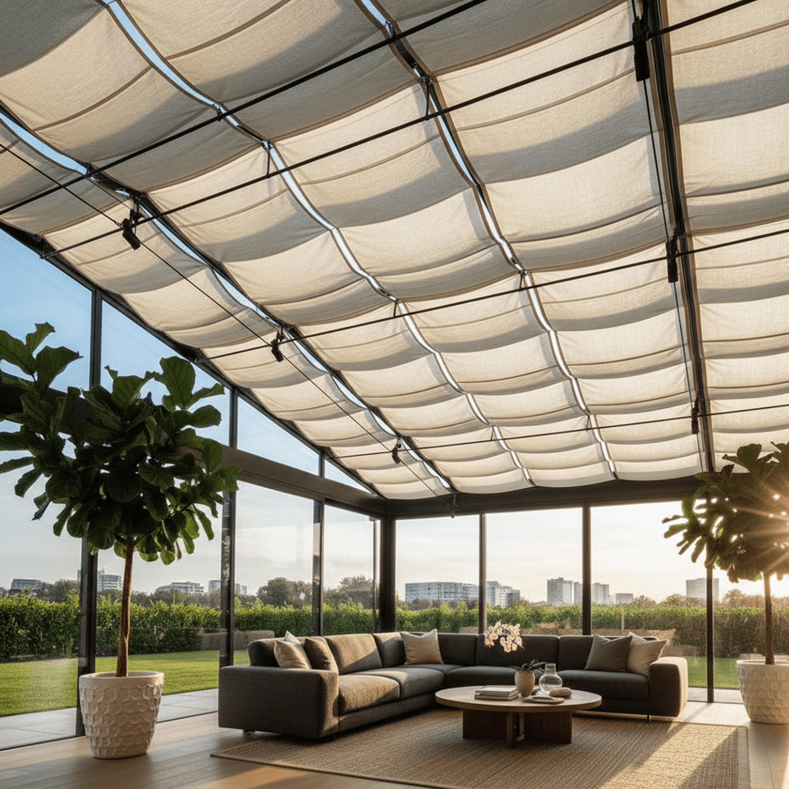 O Equilíbrio Perfeito entre Luz e Conforto A Cortina Romana de Teto é a escolha ideal para quem busca sofisticação em coberturas de vidro. Com seu design em gomos, ela traz uma estética clássica e aconchegante, transformando varandas gourmet e jardins de inverno em espaços prontos para o uso em qualquer hora do dia.